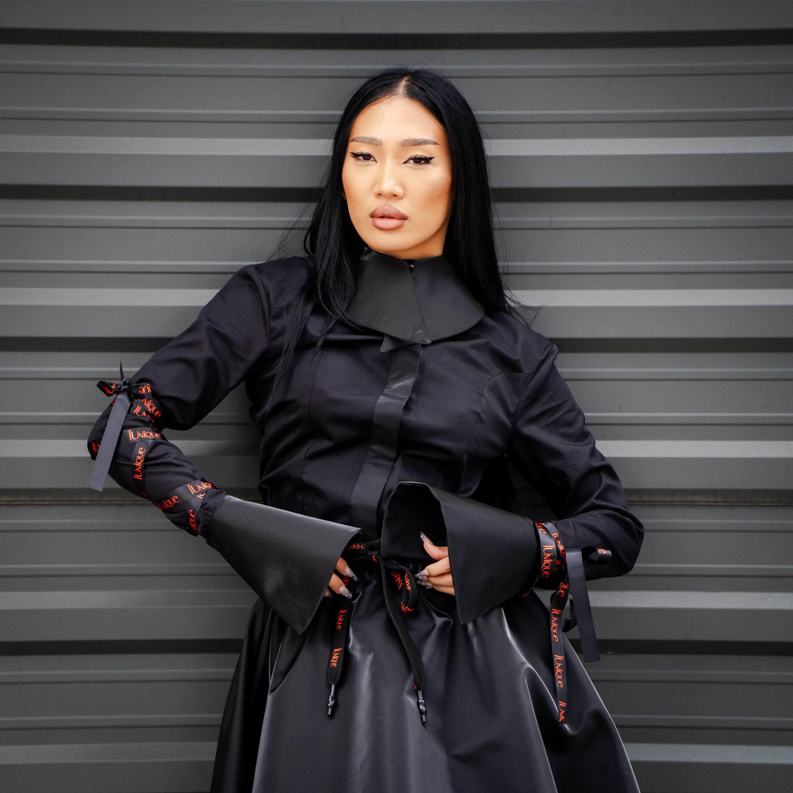 Camasa cambrata din poplin negru, cu panglici personalizate IUnique