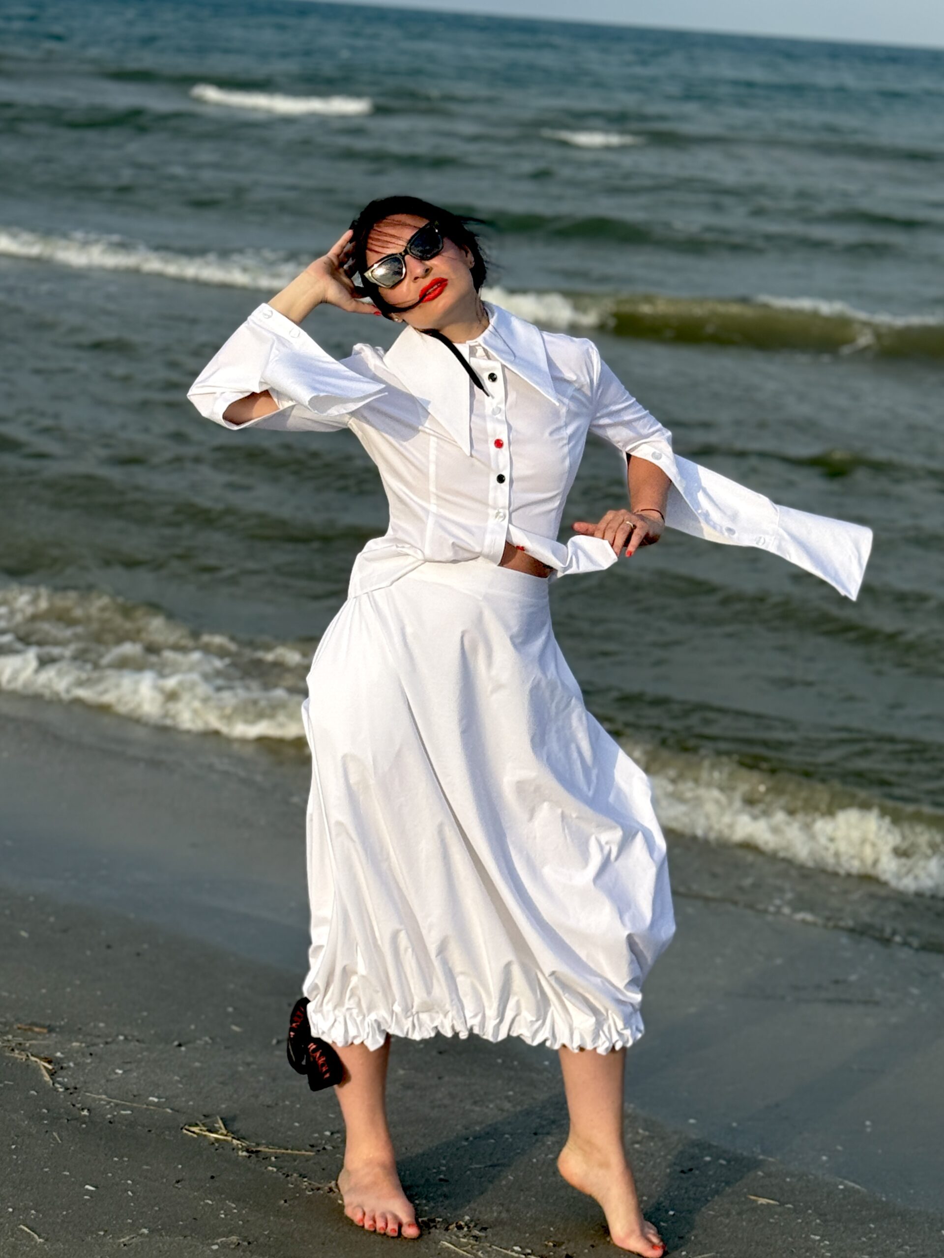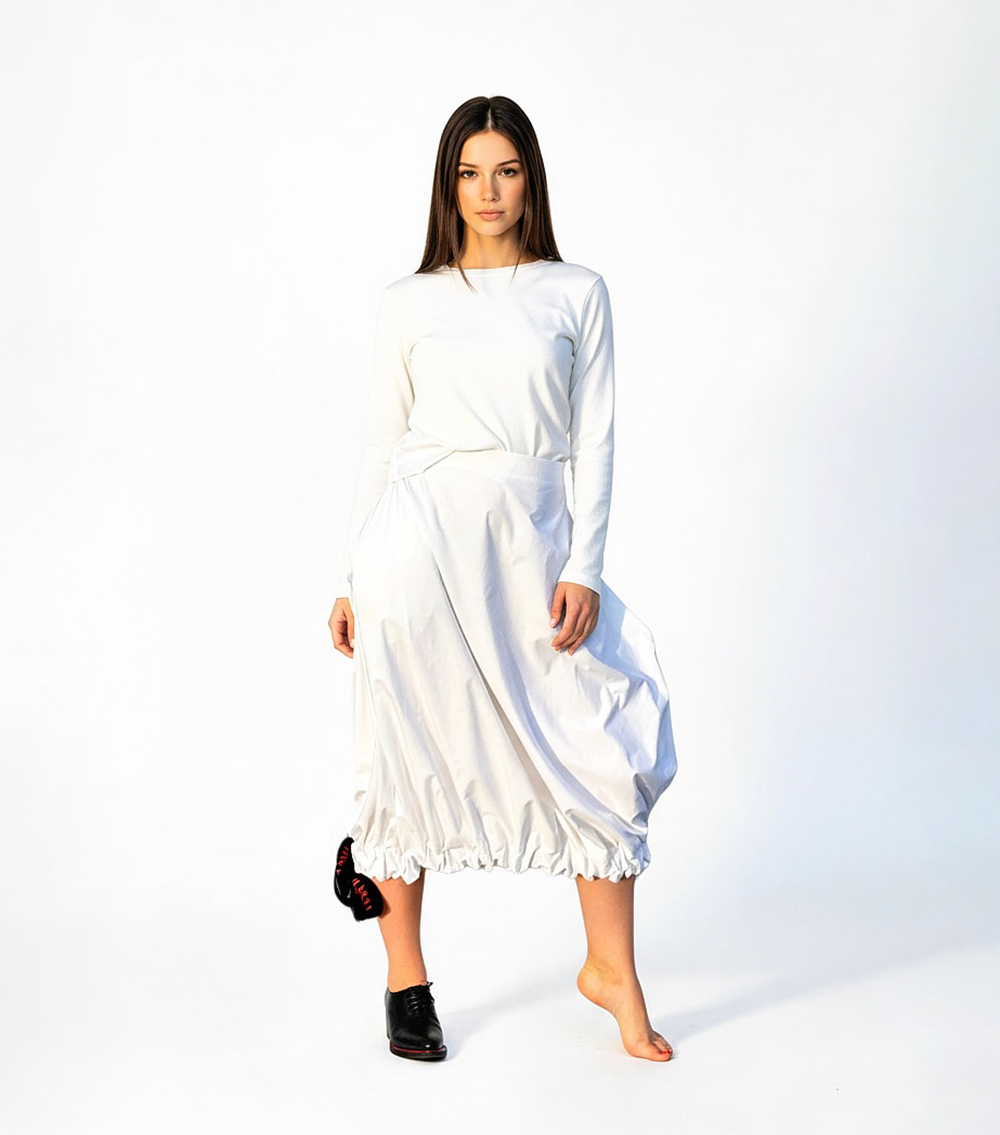 Aceasta fusta cu croiala A aduce un twist modern unei siluete clasice. Talia este fixa, bine definita, oferind un plus de structura si eleganta. Partea de jos se poate ajusta cu ajutorul unui snur discret, care permite transformarea liniei fustei – de la un look fluid, lejer, la unul mai voluminos, tip balon.
