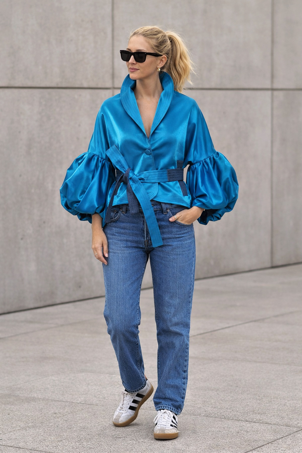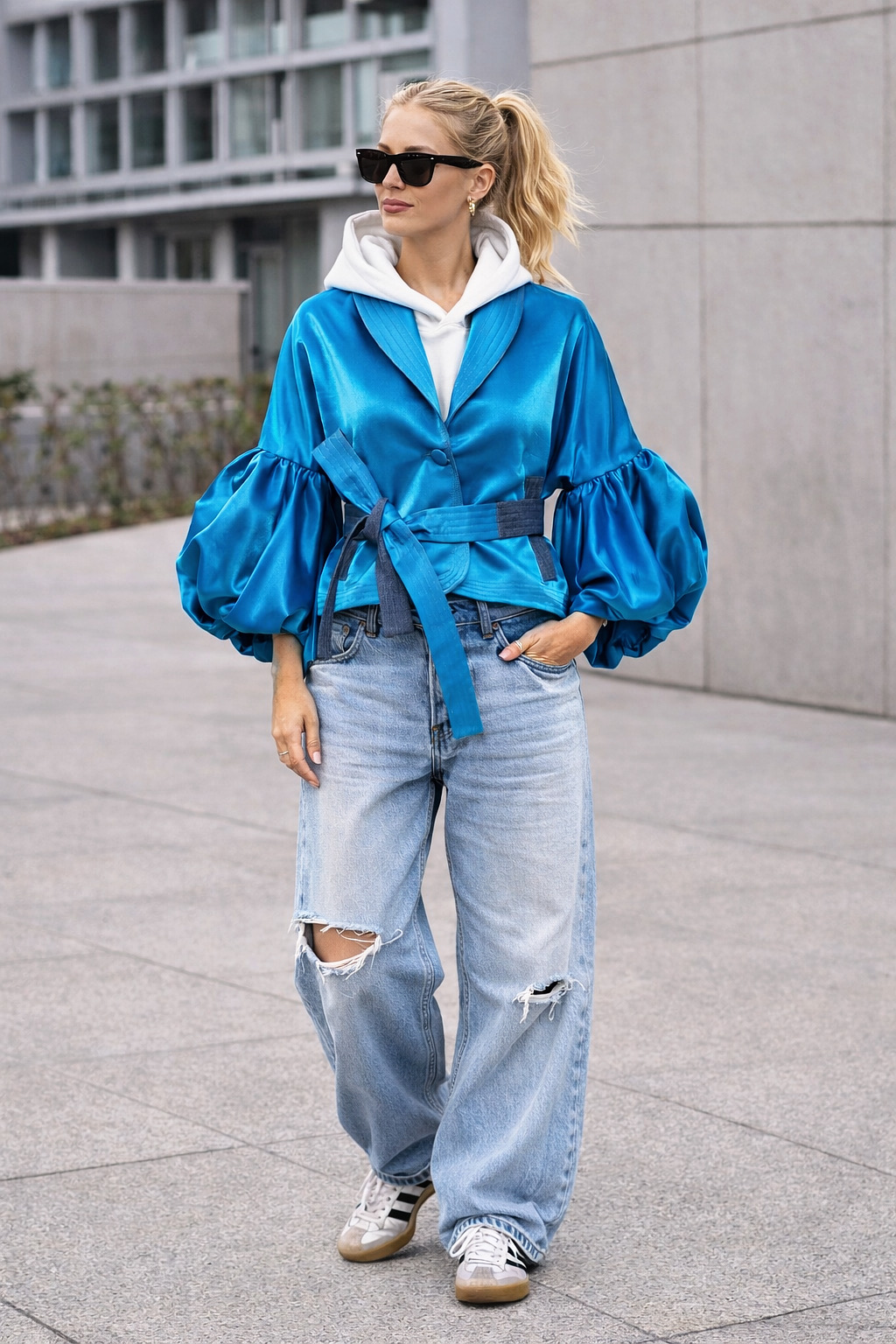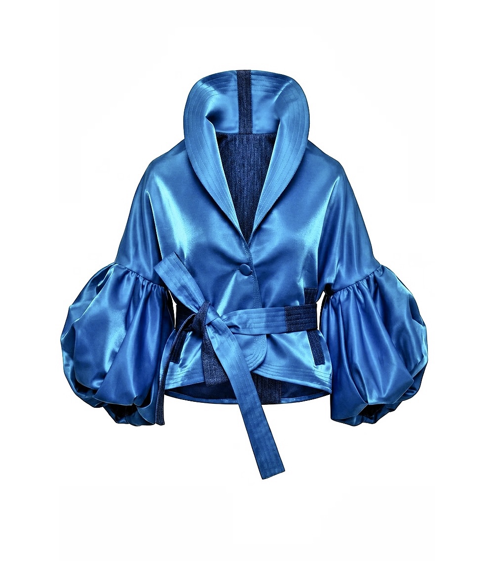 Jacheta Adams cu maneci voluminoase, Albastru si detalii denim