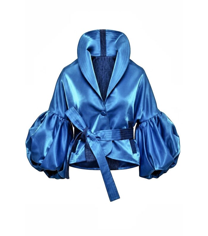 Realizată din tafta de lux, într-o nuanță electrică de albastru profund, această piesă este construită pentru femeia care nu cere atenție – o atrage natural.