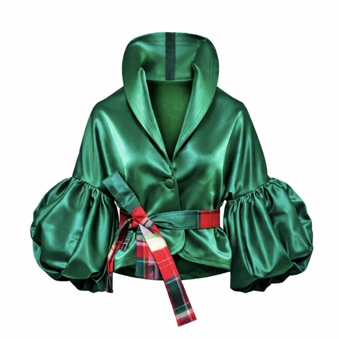 Mânecile supradimensionate creează un volum sculptural, dramatic, echilibrat de o talie definită cu cordon contrastant cu catifea.