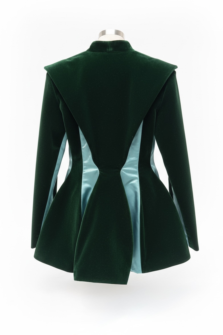 Realizat din catifea cu insertii de tafta verde, are o structura arhitecturala ce subliniaza talia si creeaza un joc rafinat de lumini si umbre.